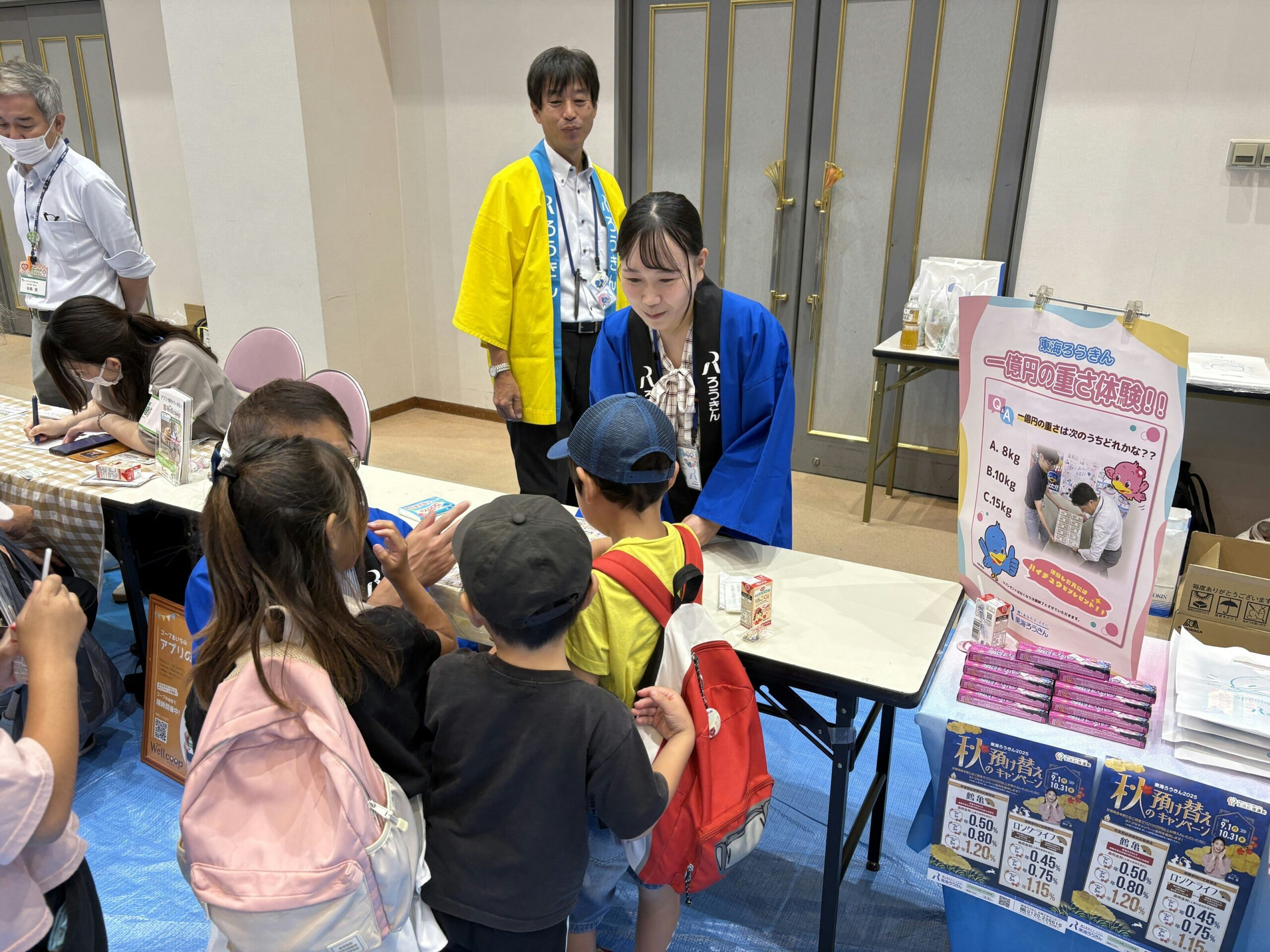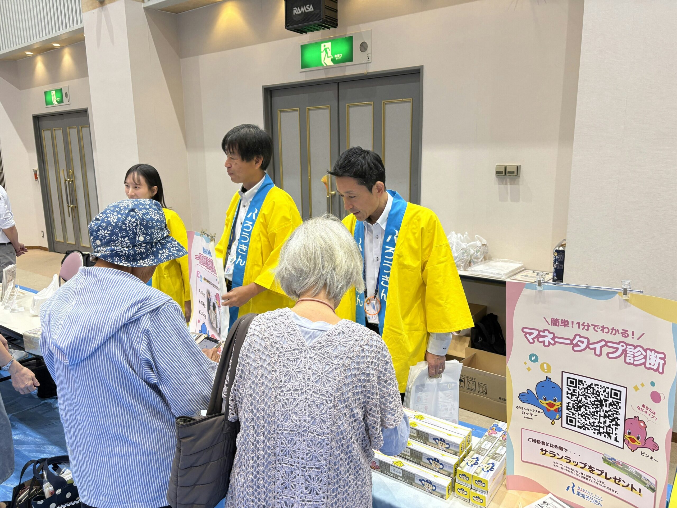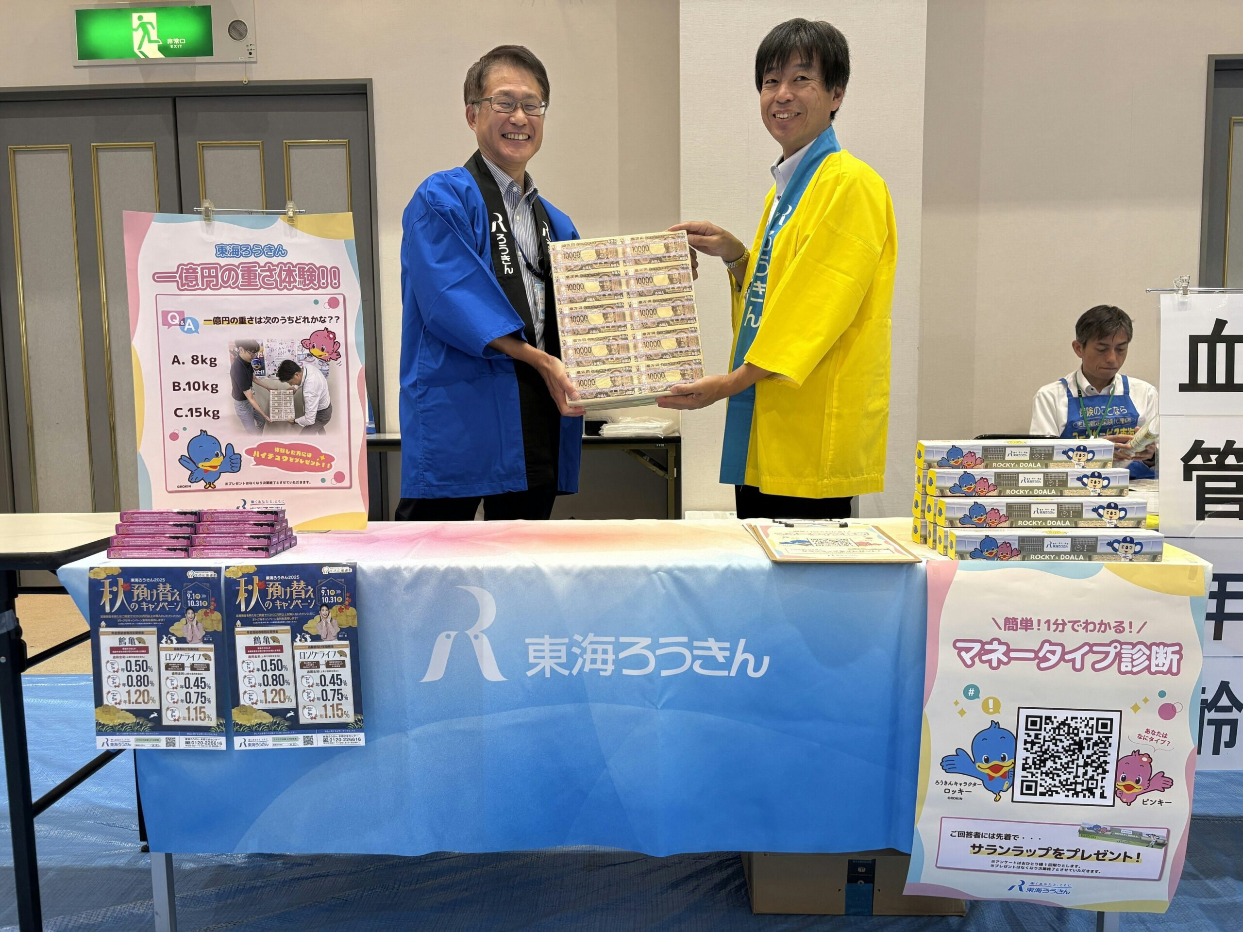 東海ろうきんのブースでは、尾張エリアを管轄する小牧支店・一宮支店の職員がスタッフとして参加し、一億円の重さ体験や1分でわかる!マネータイプ診断を行いました。